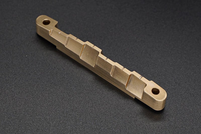 Tune-O Typeブリッジにサウンドは少し似てはいるが筐体一体型ゆえに鳴りのロスがなくダイレクト感、サスティーンが増しが増し、音のまとまり感が向上。特に中低域の押し出し感が増し、ブラス特有の音の強弱に順応に反応しバランスの良い不快でない”音楽的な”ブライトさを持ったトーン。筐体一体型に加えポジション問わずどこを弾いてもデットポイントも無く統一感のあるトーンであるため心地よく響く。素材的に若干重量もありそのため若干生音は少し音量が落ち着くが、プラグド時は絶妙なサスティーンを得られる。特にフロントP.U.時での音の分離感、トーンは絶妙。また幾多の形状を試し、この形状がサウンド的に音がもたつく事もなくベストであり、ギター搭載時も古めかしいヴィンテージ・ルックスである。